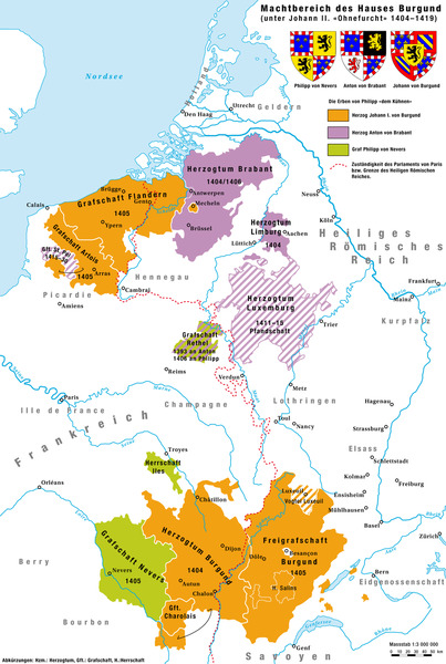 Гильом (или Вильгельм) VII, герцог Юлихский, и он же Гильом I (1364-1402), герцог Гелдердна, стакнулся с англичанами и вообще вел себя по отношению к королю Франции нахально и вызывающе, требовалось его примерно покарать и вот, во главе экспедиционной армии встал Филипп Бургундский. Однако, герцогство не имело общей границы с Францией, и самая прямая дорога во владения Гильома вела через Брабант. Правящая герцогиня Брабанта – Жанна была в ужасе от того, что вскоре через её цветущие деревушки и городки потопает французская армия с известными последствиями. А она мало того, что ни в чем не виновата, так беспокойный Гильом со своим отцом и ей житья не давали, претендуя на ее герцогство.